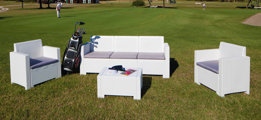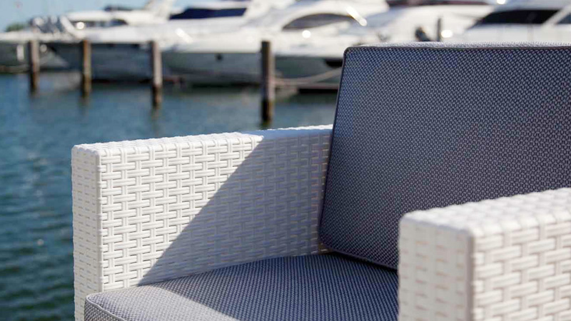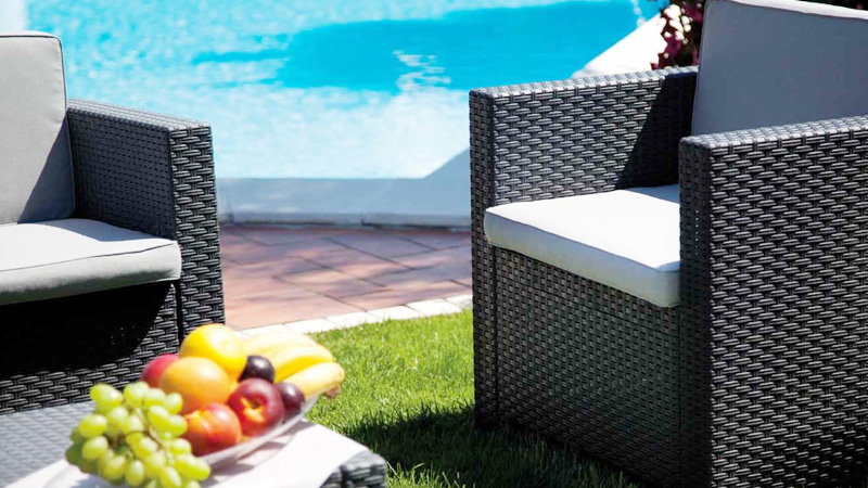 Design sofisticato e finiture in simil rattan conferiscono al SET CAPRI un'estetica esclusiva unita al comfort ottenuto grazie allo schienale reclinabile e all'abbinamento di cuscini ergonomici dallo stile elegante e raffinato.