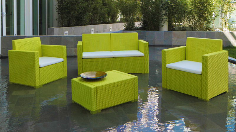 Design sofisticato e finiture in simil rattan conferiscono al SET CAPRI un'estetica esclusiva unita al comfort ottenuto grazie allo schienale reclinabile e all'abbinamento di cuscini ergonomici dallo stile elegante e raffinato.